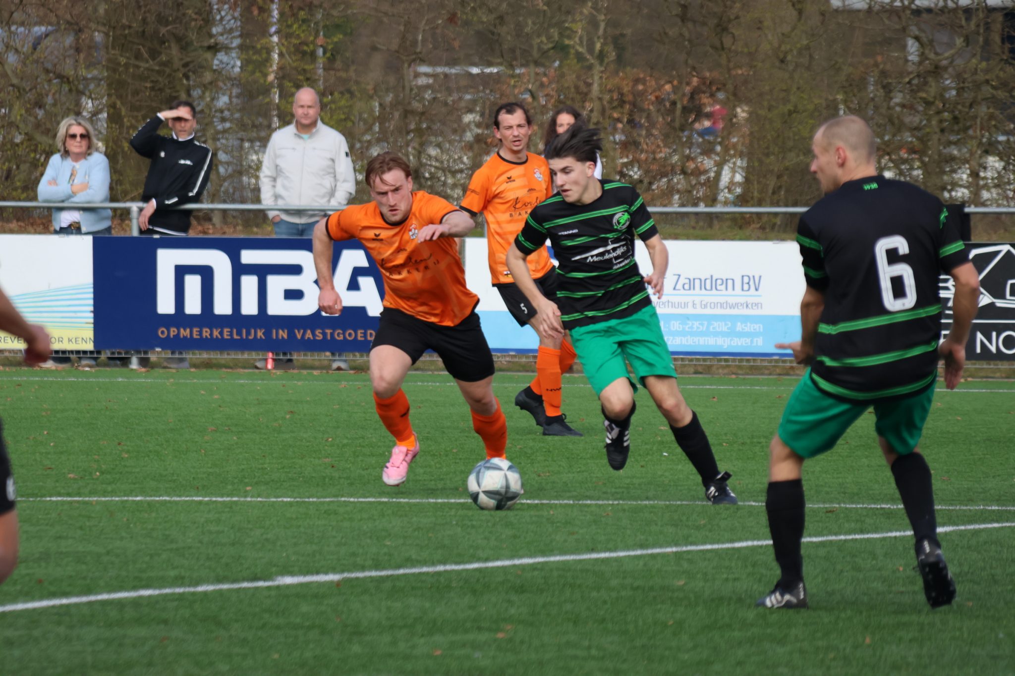 In de rust stond de vlag er nog anders voor, want op dat moment leidde Heeze in Asten met 0-1. En opnieuw profiteerden de Heezenaren van de eigen fysieke kracht en lengte in het team, terwijl NWC het meer van het voetbal moest hebben. De Astenaren startten nog wel aardig, maar gaandeweg kreeg Heeze steeds meer grip. In de vijftiende minuut trokken de bezoekers de voorsprong naar zich toe, toen captain Gijs Moerenhout – normaliter aanvaller maar nu centrumverdediger – een haarscherpe hoekschop in de verre hoek kopte: 0-1. Zes minuten later voorkwam NWC-doelman Koen van Dijck de 0-2, want hij stompte een vrije trap van Job van den Bersselaar uit de hoek. Na een half uur spelen miste de boomlange aanvalsleider Maarten Veerman een volgende serieuze kans op de tweede Heeze-goal uit weer een gevaarlijke corner. Via Robin Rijnders kreeg NWC nog een schietkans, die door goalie Lars Bouwmans werd gepareerd. De thuisclub had wel de dreiging, maar het kon niet echt toehappen.
